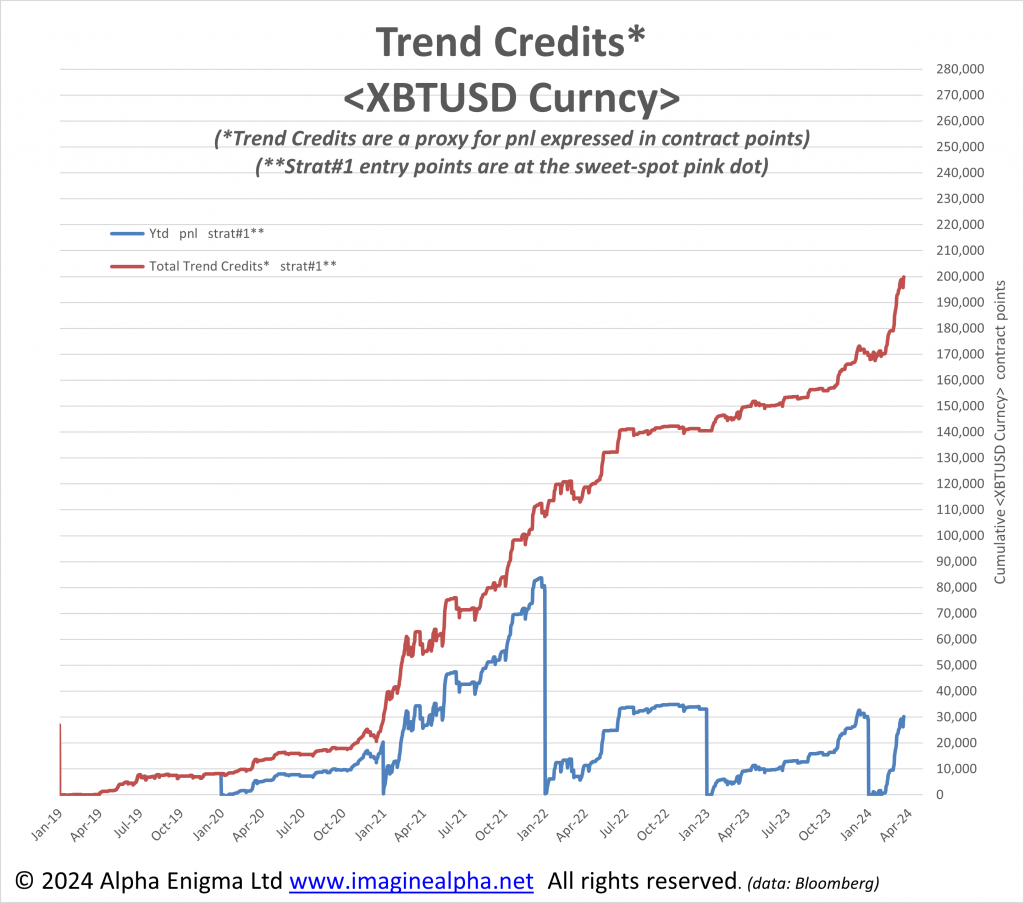 So far in 2024 XBT has produced 30,000 Trend Credits* matching the tally of 2023 and approaching that of 2022. This could be the moment when the trend takes a breather. If so the range will narrow above 58,000 and below 68,000 for a few more weeks.