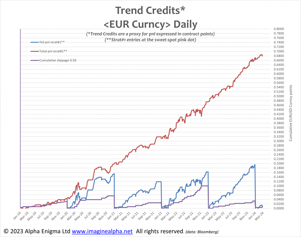 The graph below shows the propensity of EUR/USD to trend over time. It is not a firm back testing exercise. It shows that drawdowns can be contained at the time of reversals.