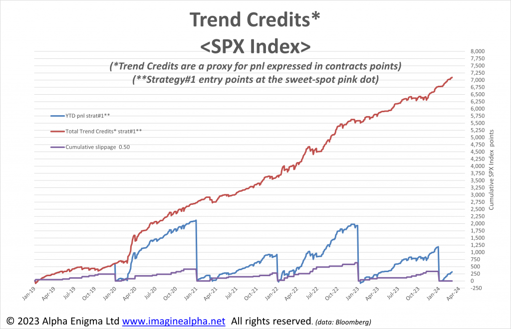 The graph below shows the propensity of the SP500 to trend, both UP and DOWN. The exhibit below is not a firm back testing exercise, hence the use of the term Trend Credits to account for the accumulated amount of contracts points over the entire lookback window. Nevertheless, following trends around the sweet-spot (pink dot) would enable to limit drawdowns and increase the risk/reward profile.